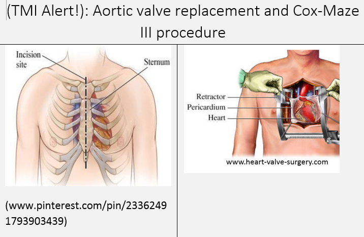 To have enough access to perform the Cox-Maze III procedure the surgeon has to cut the full length of the sternum (“median sternotomy”). Retractors pull the sternum out of the way during the procedure. The pericardium (the membrane enclosing the heart) is cut open to get to the heart. The surgeon cuts through the aorta to allow access to the valve. The old valve is removed, and a new one inserted (in my case a bovine tissue valve):