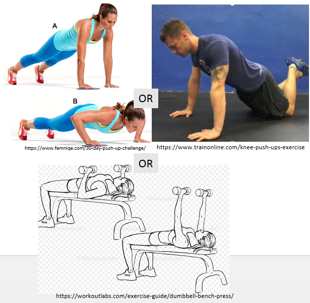 The pushes are easy with minimal equipment, just the floor for pushups (from the knees when just starting out, from the feet with straight legs when you get stronger). Or you can use a bench to do bench presses with dumbbells, or even lie on your back on the floor and do bench presses with dumbbells with a slightly restricted range of motion.