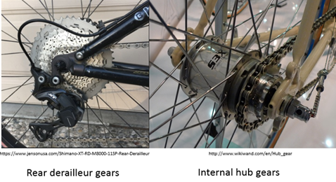 For internal hub gears there’s an additional factor. You still divide the chainring teeth by the sprocket in back. But then you multiply by a gear ratio for the hub. For example the famous Sturmey-Archer 3 speed hub has ratios of 0.75 in first, 1 in second gear, and 1.33 in third gear. So if you have a 26″ wheel, 44 teeth up front and 14 in back, and you’re in 3rd gear, you get 44/14 times 1.33 times 26 = 109 for your gear inches.