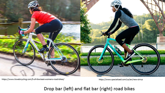 As for type of bike, I recommend a more upright bike like a “comfort bike” or a hybrid for most people, especially starting out. These have flat bar handlebars that feel more natural than road-bike style “drop bars”. If you don’t think you’ll ever want to go off pavement, a “flat bar road bike” is a good choice, because they have skinnier tires and you can go pretty fast. Otherwise a hybrid with fatter tires and at least front suspension will do well on road or dirt.