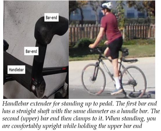 The easiest thing to do is just standing up occasionally for a short period to take a “butt break”. Or, if you have big enough gears, like a 48 tooth chainring up front and an 11 tooth gear in the back, you can pedal standing for longer periods at a comfortable pace. With flat bars you can also make the position nice and upright with bar ends. I just gang two pairs together as shown in the picture above, so when I stand up I’m not hunched over. There is zero discomfort pedaling this way, and I find the motion as relaxing as running. It’s a good workout too.