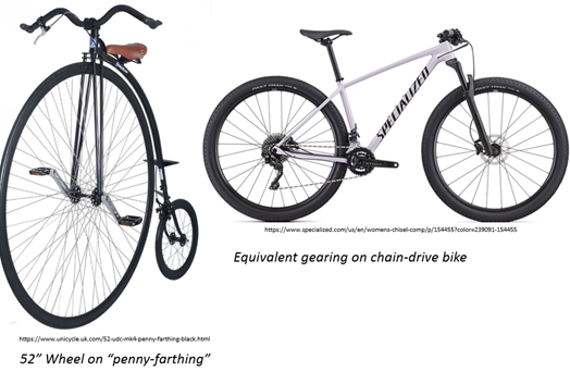 Conventional bike gearing is calculated using the number of teeth on the chainring in the front divided by the number of teeth on the sprocket in the back. This, multiplied times your wheel size, gives the gear inches. This is an interesting number which dates back to the old “penny farthing” bikes with the huge front wheel. The gear inches is the size of the wheel on one of those high wheelers that would be equivalent to the gear you are in on your bike. The higher this number, the further you go with a single revolution, but the harder it is to pedal.
