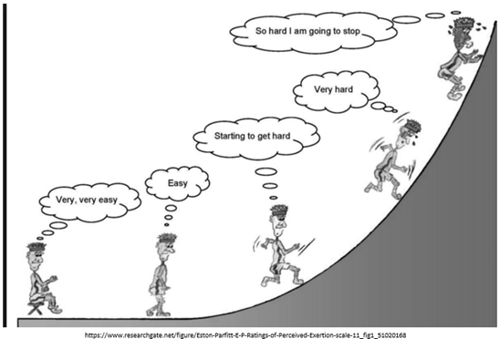 What I’ve described previously for monitoring intensity of aerobic exercise using your breath is a simplified version of judging intensity by “perceived level of exertion” (also called “rating of perceived exertion”). Recently RPE has been shown to correlate very well with heart rate [1]. I think it’s possible to make too big a deal of this with a detailed scale, there are basically two important levels of exertion: one which is within your current comfort zone (“brisk but comfortable”), and one that stretches your limits by pushing somewhat beyond what’s currently comfortable. If you’re the type that tends to go too hard on recovery days following a hard effort, a third level is also useful- just “comfortable” or “easy”.