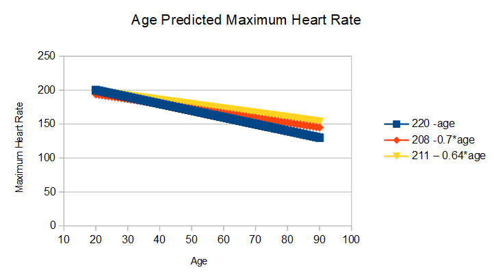 [update 06/17/21]: A 2012 study [9] did an analysis using data on thousands of subjects that were known to be physically active. They came up with the prediction formula max heart rate = 211 − 0.64·age. This is only a few beats off for me. The authors claim it is accurate to within about 11 beats. It’s off by about 7 for me. I plotted the 220-age vs. the Tanaka formula 208-0.7*age, and the formula for active adults, 211 − 0.64·age. It appears 220-age is the most conservative as shown in the plot I created below. That may be why it is still used for cardiac testing purposes: