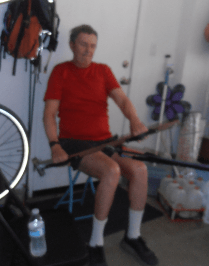 I also kludged up a ski trainer with resistance bands. This mimics the very nice one by Concept2, but just uses resistance bands and a bolt in the ceiling. You can get a really good workout with it, crouching to get the legs involved, “hip-hingeing”, and using the abs and arms: