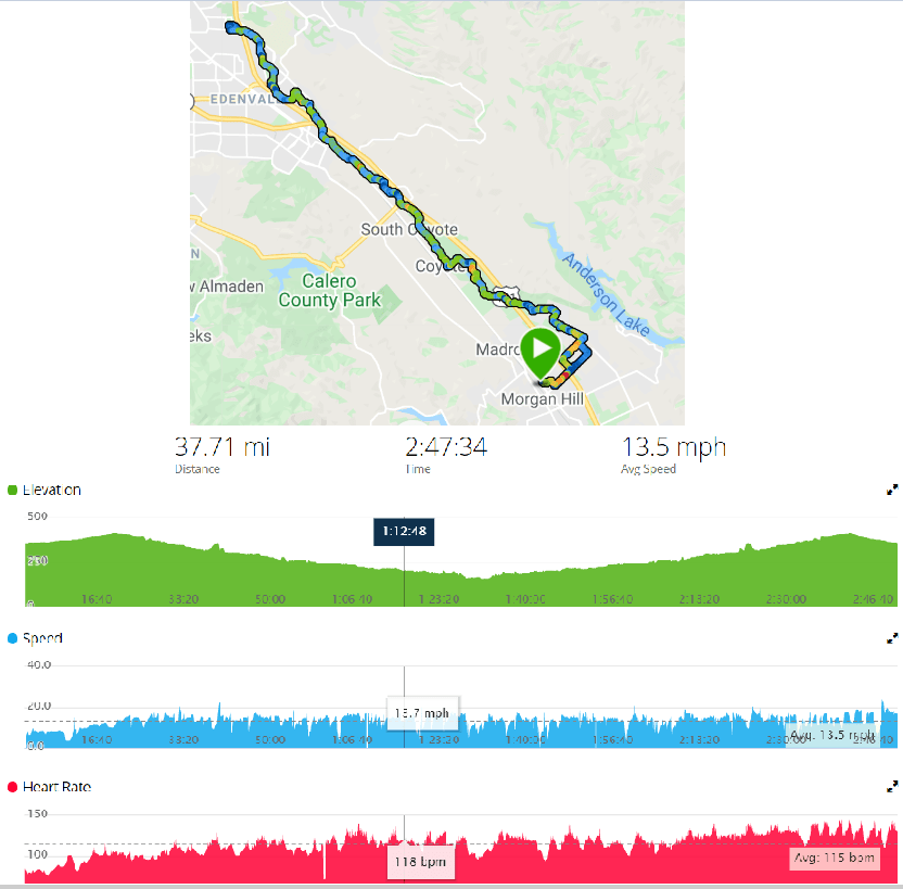 This was just under 38 miles. At this pace a century ride would take about 7 hours, which is perfectly reasonable. Now to pick out a relatively flat century in this area to train for. The “I Care Classic”, put on by local Lion’s clubs for charity, is a good choice next May. I’ll plan on that, but would also like to do one sooner so I signed up for the SAC Century challenge in Sacramento on Oct. 2. Now that I’ve got a challenge to point towards, it’s time to start ramping up my mileage!