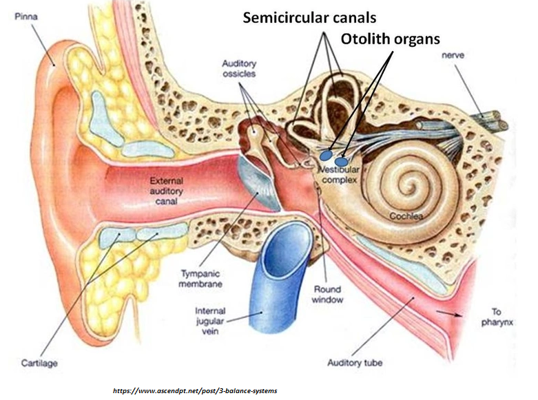 The inner ear is best known for the cochlea, which converts sound into nerve impulses, for our hearing. But it also contains the vestibular system, which is crucial for balance. The vestibular system is responsible for detecting your head’s orientation in space and its motion. Angular acceleration, or rotational motion, is detected about 3 separate axes by the semicircular canals. Linear acceleration, as well as gravity, are detected in the forward and back direction as well as the side to side direction, by two “otolith organs”, the utricle and saccule. These sensors both directly trigger various reflex movements and provide information to the brain.