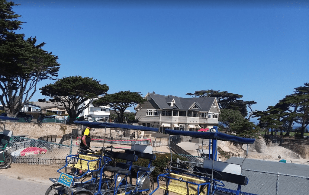 Our first view of the Bay and Monterey peninsula as the trail came over a hill in Marina.The Beach in Seaside, right before we rode onto the peninsula. The waves here are fairly calm compared to beaches along the open ocean.Passing by Monterey Bay Kayaks, where I’ve rented and taken lessons in the past. This is a great place to launch from. To the left are the canoes of Ke Kai O’Uhane Outrigger Canoe Club.Our ride leader Kris looking at Fisherman’s wharf on the left.Monterey State Historic Park has some interesting historic buildings around this plaza, and a nice museum with a beautifully restored first-order Fresnel lens formerly in service in a lighthouse.The park at Lover’s Point in Pacific GroveOn the way back we went out on the Coast Guard Pier. Some huge Sea Lions were sunning on the rocks (and occasionally barking). The Spanish name Lobos Del Mar make more sense to me because these remind me of wolves a lot more than lions.Pelicans and Cormorants sharing a rock