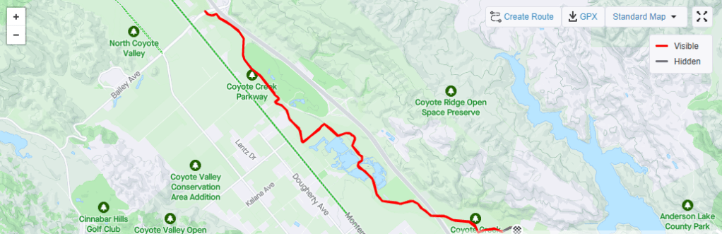 I went out and back on Coyote Creek trail on my recumbent, from the Anderson Visitor center to the Bailey underpass and back, a total of 20.69 km (12.9 miles) in a time of 58:43 at an average speed of 21.1 km/hr(13.2 mph). My average heart rate was 124, right around the 120 I was shooting for. This ride felt great so I will keep repeating it as a challenge. I would really call this “king of the flat” rather than “king of the mountain” because it is not very hilly. This was the perfect terrain for my recumbent.