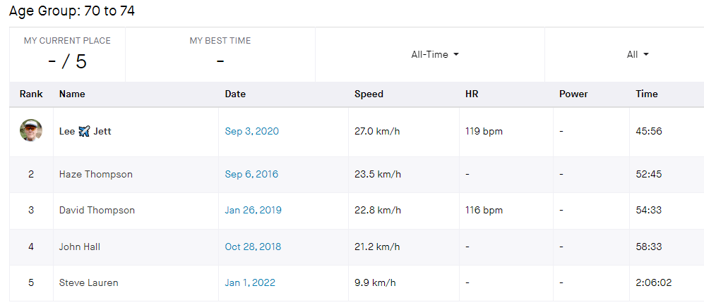 I created my own segment on Strava, so I thought that made me the “king of the mountain” until someone else rides it faster. But it turns out Strava found others in the 70-74 age group who had done it so I’m now number 5. As I believe I’ve previously mentioned, there are a lot of fast old folks in this area! Getting up to number three would require increasing my average speed from 21.1 kph to 22.9 which is a reasonable short-term goal to shoot for. I would need to knock off 13 minutes to get to the top of the leaderboard, that’s more challenging.